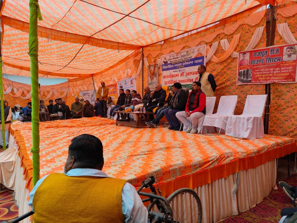 कार्यक्रम में मुख्य अतिथि पशुधन एवं अल्पसंख्यक कैबिनेट मंत्री धर्मपाल सिंह ने दीप प्रचलित कर बच्चों ने सरस्वती वंदना के साथ वंदना के साथ कार्यक्रम का शुभारंभ किया, उन्होंने ग्रामीणों से रूबरू होकर प्रधानमंत्री नरेंद्र मोदी जी की योजनाओं के बारे में विस्तार से जानकारी दी और उन्होंने कहा विकसित भारत संकल्प यात्रा सरकार की ओर से गांव-गांव में पहुंच रही है इसमें सरकारी अधिकारी व कर्मचारी मोदी जी की सरकार की योजनाओं के बारे में जानकारी देंगे और किन-किन लोगों को इसका लाभ मिल रहा है, मोदी जी का सपना है पिछले 9 साल से 2047 तक भाजपा को भारत को विकसित भारत बनाना है और उन्होंने कहा मैं पशुधन विभाग का मंत्री हूं यहां जितने भी हमारे बहन भाई बुजुर्ग बैठे हैं, हम लोग खेती करने वाले किसान हैं और खेतों में हम लोग खेती रासायनिक उर्वरक कीटनाशक दवा लगाकर अनाज पैदा कर रहे हैं जिससे हमारे समाज में कैंसर जैसी भयंकर बीमारी का शिकार हो रहे है इसलिए हम लोगों को गौ पालन करना चाहिए, गौ पालन के लिए सरकार प्रतिदिन ₹50 देती है, गाय के दूध से तैयार उत्पादकों का बाजार में अच्छा मूल्य मिलता है गोमूत्र और गोबर से भी कई तरह से उत्पाद तैयार किए जा सकता है और किसान अपनी आय बढ़ा सकते हैं और अपने खेतों में देसी गोबर खाद का प्रयोग करें, उन्होंने गायों का ऐतिहासिक और आर्थिक महत्व बताया पशुओं को ना छोड़ने की अपील की, सरकार गायों की नस्ल सुधारने के लिए लगातार प्रयास कर रही है अगर कोई किसान अच्छी नस्ल की गाय बाहर से लाता है उसे एक गाय पर 40000 का अनुदान, दो गाय पर 80000 का अनुदान दिया जाएगा, हमारी सरकार अच्छी नस्ल की गाय के लिए निशुल्क कृत्रिम गर्भाधान कर रही है, प्रत्येक विभाग का अलग-अलग जन समस्या सुनने के लिए काउंटर लगे होने से अधिकारियों का कर्मचारियों पर नाराजगी जताते हुए। इस बार आप लोगों को छोड़ रहा हूं अगर आप लोगों ने गांव-गांव जाकर ठीक से लोगों के मोदी जी की योजनाओं के बारे में ठीक से जानकारी नहीं दी और उसका लाभ नहीं पहुंचा तो आप लोगों के खिलाफ कार्रवाई की जाएगी।